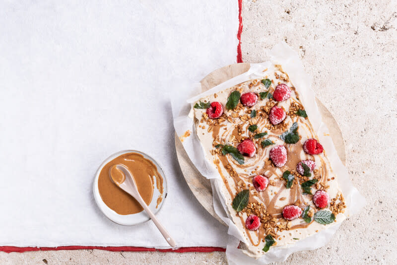 Recouvrez un plat de 15 x 22 cm de papier sulfurisé. Répartissez-y le mélange Alpro, ajoutez des cuillères de beurre de cacahuète supplémentaire, puis dispersez les framboises, le granola et la menthe sur le dessus.