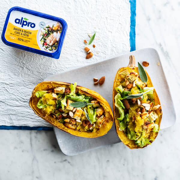 Coupez la courge spaghetti en deux dans le sens de la longueur et, à l'aide d'une cuillère, retirez les graines et les pépins. Assaisonnez généreusement. Placez les moitiés côté coupé vers le bas sur une plaque de cuisson recouverte de papier sulfurisé. Mettez au four pendant 45 minutes jusqu'à ce que la chair soit tendre.
