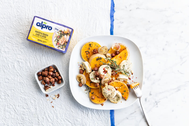 Faites chauffer un peu d’ Alpro Cuire & Rôtir dans une poêle et faites cuire la courge butternut avec un peu de thym à feu doux. Pensez à retourner les bâtonnets de butternut pour qu’ils soient bien al dente. Assaisonnez à votre convenance avec un peu de sel et de poivre.