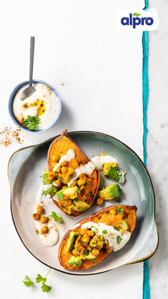 Remplir les peaux de patates douces avec le mélange de pois chiches, puis terminer par une généreuse cuillerée de sauce onctueuse à la noix de coco sur le dessus. Un délice !