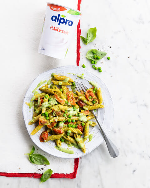 Égouttez les pâtes, versez-les dans la poêle avec la sauce pesto. Incorporez l'Alpro Alternative Végétale au Yaourt. Assaisonnez avec du poivre noir et régalez-vous !