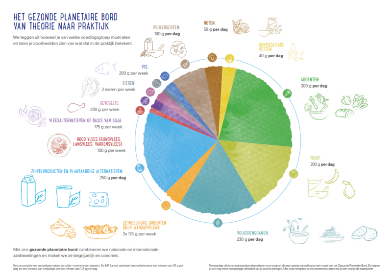 Het ‘Gezonde Planetaire Bord’ helpt om keuzes te maken. Het is een gids die je inspireert om duurzamer te leven én te eten. Je leert wat je allemaal kan eten en welke hoeveelheden goed zijn voor jou en voor de planeet.