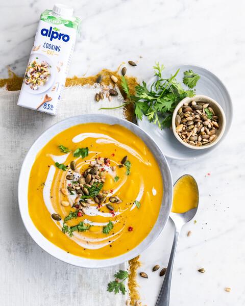 Schep de soep in serveerkommen. Nu komt het leuke gedeeltje. Drizzle de Alpro Natuur Plantaardig Alternatief voor Yoghurt Zonder Suikers in drie concentrische cirkels op elke kom. Trek met een tandenstoker door de romige cirkels, vanuit het midden naar buiten, om een spinennweb te crëren. Garneer met een snufje chilivlokken en verse tijm, en serveer met de zwarte vleermuisvormige naanbroden. Spookachtig lekker!
