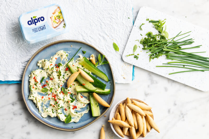 Meng in een kom een hoeveelheid Alpro light smeren met de fijngesneden tuinkruiden. Smeer de spread uit op een serveerschaal of -bord.