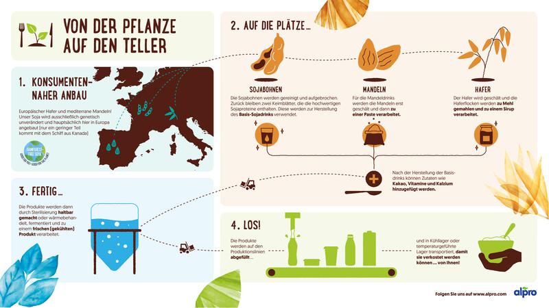 Die Art und Weise, wie Ihre Nahrungsmittel angebaut, geerntet und produziert werden, wirkt sich auf die Erde, die Tiere, das Wasser, die Luft und somit auf das gesamte Klima auf. Deshalb nehmen wir Sie auch gerne mit in die wundersame pflanzliche Welt, in der unsere Alpro-Drinks produziert werden. Verfolgen Sie unsere leckeren Sojabohnen und Mandeln und unseren köstlichen Hafer durch den gesamten Produktionsprozess bis hin zu Ihrem Tisch.