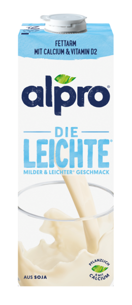 Sanfter, milder Genuss mit über 30 % weniger Fett und Zucker*. Perfekt für deinen Kaffee, Smoothie oder pur. Dazu ist Die Leichte eine wertvolle Quelle für Calcium und Vitamin D und steckt voller pflanzlichem Protein. *Mehr als 30% weniger Fett und Zucker als der Alpro Sojadrink Original