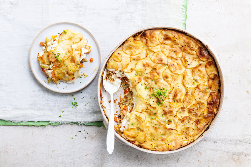 Mit Kartoffelscheiben abschließen. Kartoffelscheiben dünn mit Öl bestreichen, Auflauf mit Alufolie abdecken und 15 Minuten im Ofen backen.