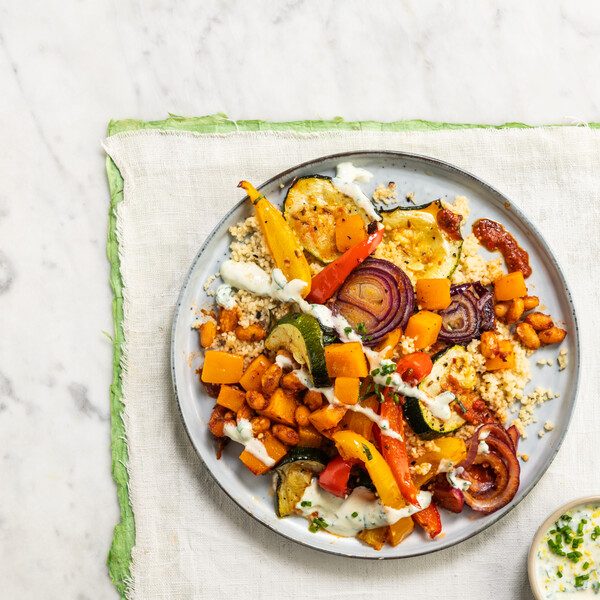Harissa Butter Bean & Roasted Root Vegetables with Herby Dressing and Couscous