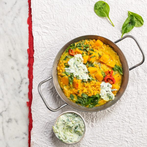 Spinach, Squash & Lentil Dahl with Raita