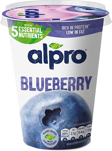 Water, Hulled soya beans (9.8%), Sugar, Blueberry (5.7%), Calcium (Tri-calcium citrate), Stabiliser (Pectins), Black carrot^, Carrot and blueberry^, Natural flavouring, Acidity regulators (Sodium citrates, Citric acid), Sea salt, Antioxidants (Tocopherol-rich extract, Fatty acid esters of ascorbic acid), Vitamins B2, B12, D2, Live cultures (S. thermophilus, L. Bulgaricus). Concentrates.