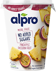 vesi, ananas-passionhedelmäsekoitus (13,9%) (ananastäysmehutiiviste (8,1%), ananas (3,8%), passionhedelmä (2%)), kuoritut soijapavut (9,7%), happamuudensäätöaineet (sitruunahappo, natriumsitraatit), stabilointiaine (pektiinit), kalsium (trikalsiumfosfaatti), luontaiset aromit, merisuola, hapettumisenestoaineet (tokoferoliuute, askorbiinihapon rasvahappoesterit), porkkanatiiviste, vitamiinit B2, B12, D2, hapatteet (S. thermophilus, L. bulgaricus).