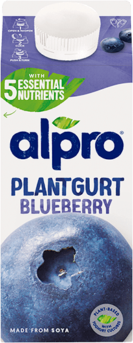 Alpro Plantgurt Mustikka – yhtä aikaa marjaisa makunautinto ja pehmeän soijavalmisteen tarjoama ainutlaatuinen elämys. Tästä tuoreesta ja voimallisesta mustikan mausta nauttii vaikka sellaisenaan suoraan purkista lautaselle kaadettuna, tai vaihtoehtoisesti sekoittamalla sitä muroihin tai hedelmiin.