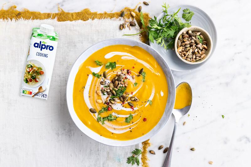 Délicieuce servie avec un filet d’Alpro Nature Alternative Végétale au Yaourt et des croûtons de pain.