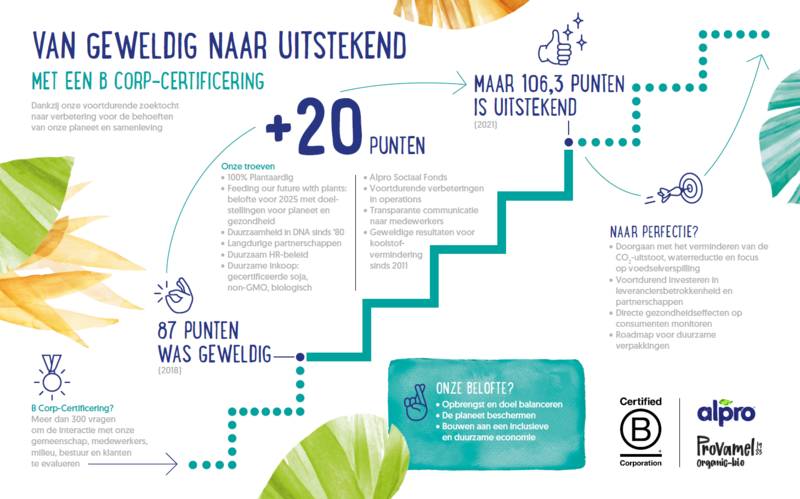 B Corp is een label dat de impact van bedrijven op de samenleving en het klimaat ijkt en vergelijkt en daarbij een rigoureus verificatieproces hanteert. De standaarden om als B Corp-bedrijf te worden geclassificeerd liggen enorm hoog. Ondernemingen worden namelijk beoordeeld op hun prestaties in de volgende vijf domeinen waarin de lat voortdurend hoger wordt gelegd: beleid, werknemers, klanten, gemeenschap en milieu. B Corp streeft er ook naar om een wereldwijde gemeenschap van gelijkgestemde bedrijven op te bouwen. Vandaag maken reeds zo’n 4000 bedrijven deel uit van de B Corp-community, ten opzichte van 2400 bedrijven in 2018. Dit bewijst dat B Corp werkelijk een opkomende en niet te stoppen beweging is, die steeds meer weerklank vindt binnen de maatschappij. Voor meer details over Alpro ’s B Corp score: https://bcorporation.eu/directory/alpro-alpro-sca
