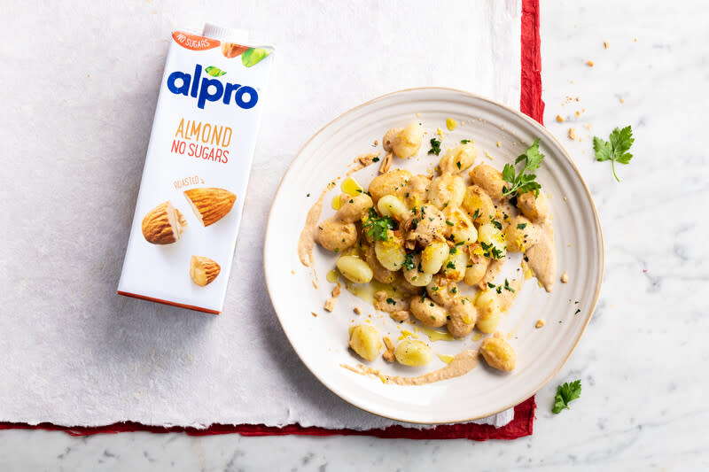 Verhit in dezelfde pan de olijfolie, voeg de gnocchi toe en giet de amandel ‘roomsaus’ erover. Breng kort aan de kook, haal van het vuur en serveer in kommen met wat gehakte peterselie. Licht, fris en onweerstaanbaar Italiaans!